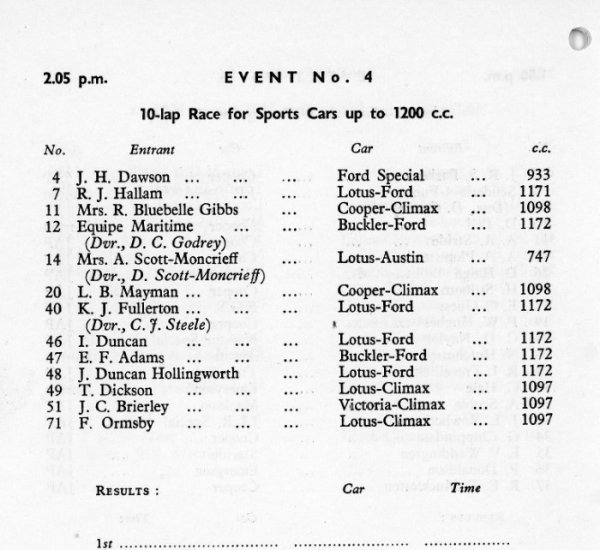 | Drivers listed: Bluebelle Gibbs (GB) | Result: did not arrive (Raced Lotus) |