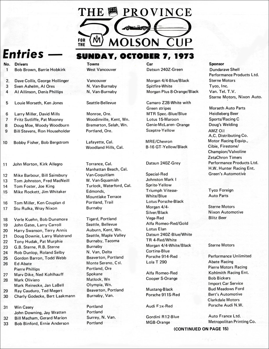 Entry List - Westwood 500 1973