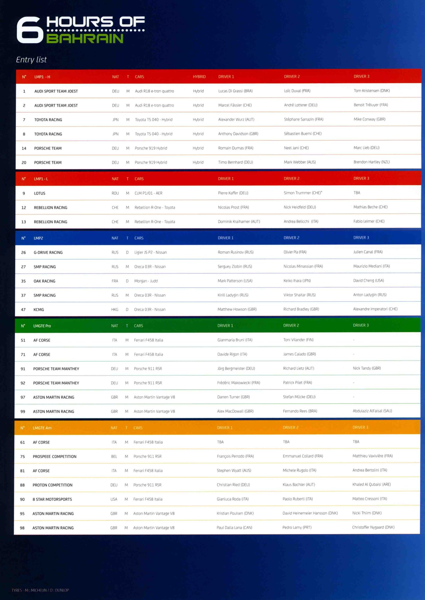 Porsche (6), Ferrari (5), Aston Martin (4), Oreca (3), Toyota (2), Audi (2), Rebellion (2)