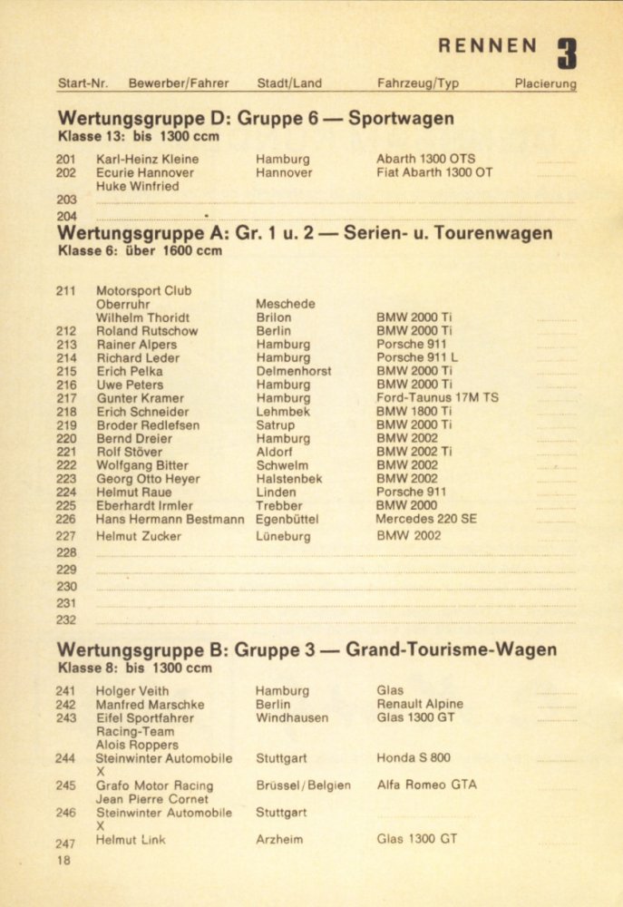 BMW 2000 (6), Porsche 911 (4), Glas 1300 GT (3)