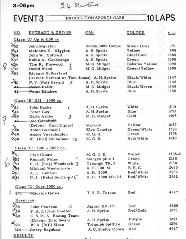 Austin-Healey Sprite (9), MG Midget (3), MG B (2), Austin-Healey 3000 (2)