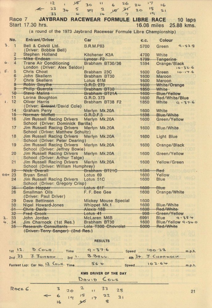 The race was a round of the 1973 Jaybrand Racewear Formula Libre Championship.