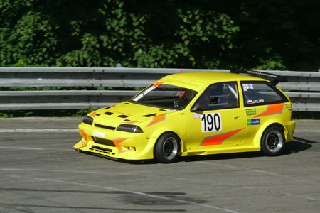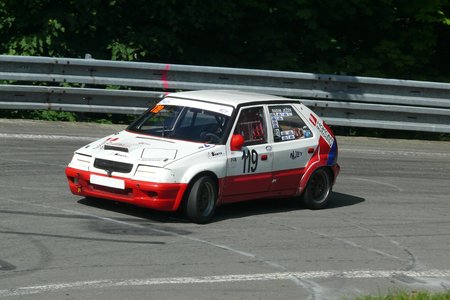 This year, for personal reasons, we could only attend the race day, on Sunday, so opted for two best places for taking photos: First heat in the Sojkova zatáčka (Sojka's Turn) while the second heat we spent at Starý start (Old Start). Of the favourite cars, there were several notable non-starters, we cannot bring you photos of: Dan Michl retired his fast Lotus Elise silhouette after the practice. And we also lost regular Felix Pailer with an old but powerful Lancia Delta Integrale, the car from the mid 80s.